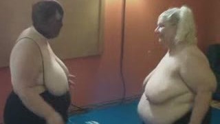 Nude wrestling match with Two fat and big breasted women