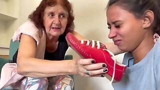 An elderly step mom kissed her son-in-law'_s feet before giving him a oral pleasure and having assfuck sex