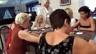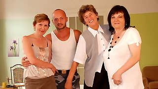 Four lusty mummies lez out before being joined by guys in an fuckfest