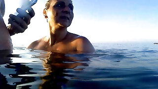 Meaty natural tits and shaved fuckbox underwater flashing by hot granny MariaOld