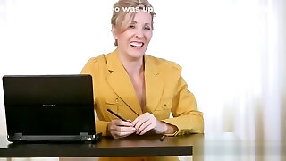 Busty mature blonde secretary in fishnet stockings and tight mini-skirt